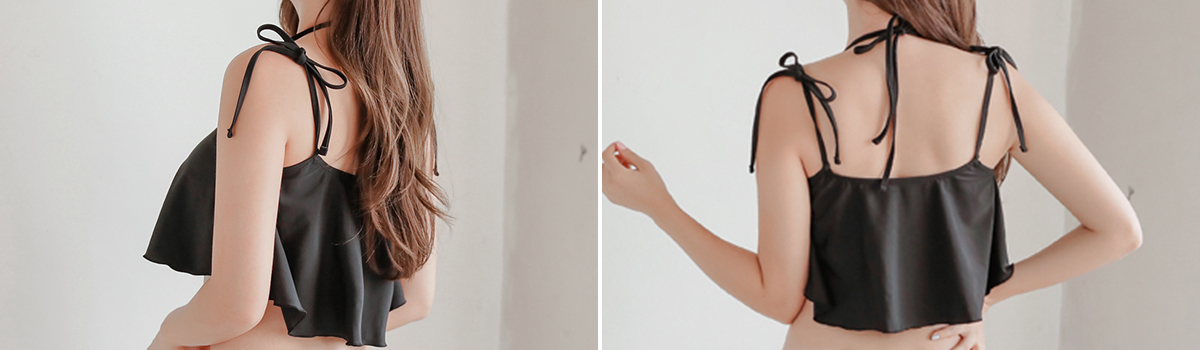 このセットを着ることで、自信に溢れたビーチスタイルを手に入れることができます。フロントクロスブラが胸元を引き立て、ハイウエストパンツが美しいシルエットを演出。さらに、ショートフリルキャミが可愛らしさをプラスしてくれます。