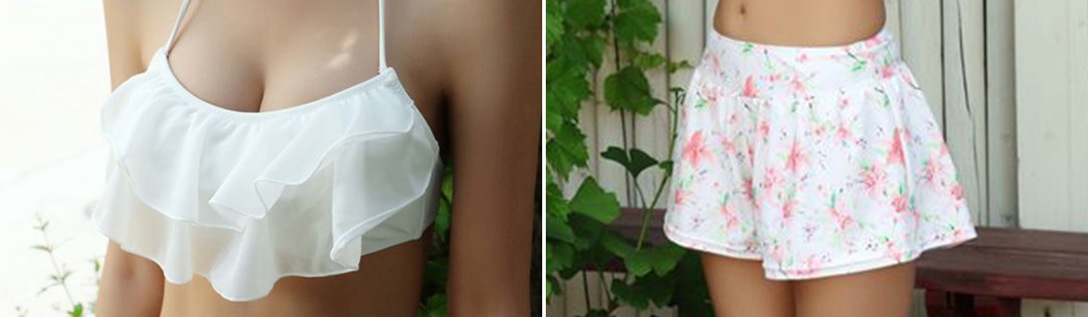 .華やかなパステルカラーと花柄の組み合わせが、女性らしさを引き立たせ、繊細なシフォン素材とフリルデザインが、上品な印象を与えます。また、白地にトロピカルな花柄のパンツとショートパンツが、リゾートムードを演出します。