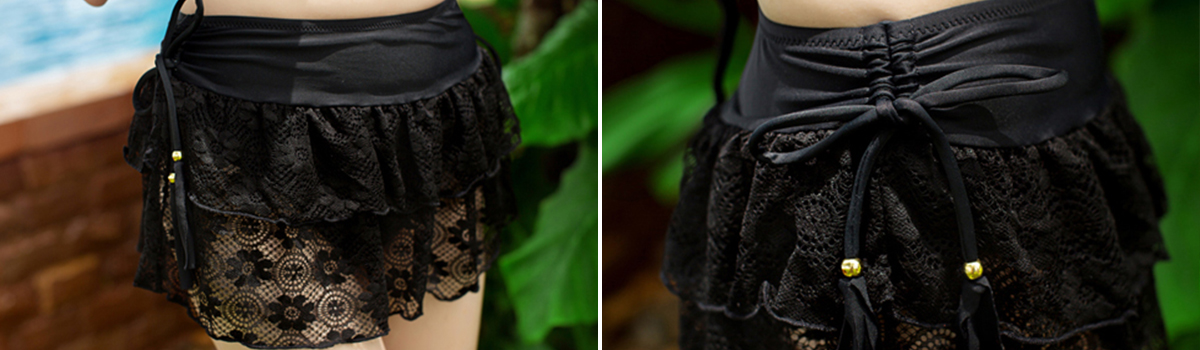 ブラはホルターネックスタイで、胸元のレースデザインがセクシーでありながら上品な印象をプラス。そして、レースフリルスカートは海辺やプールサイドで華やかさを演出し、歩くたびに揺れるフレアが女性らしい魅力を引き立てます。