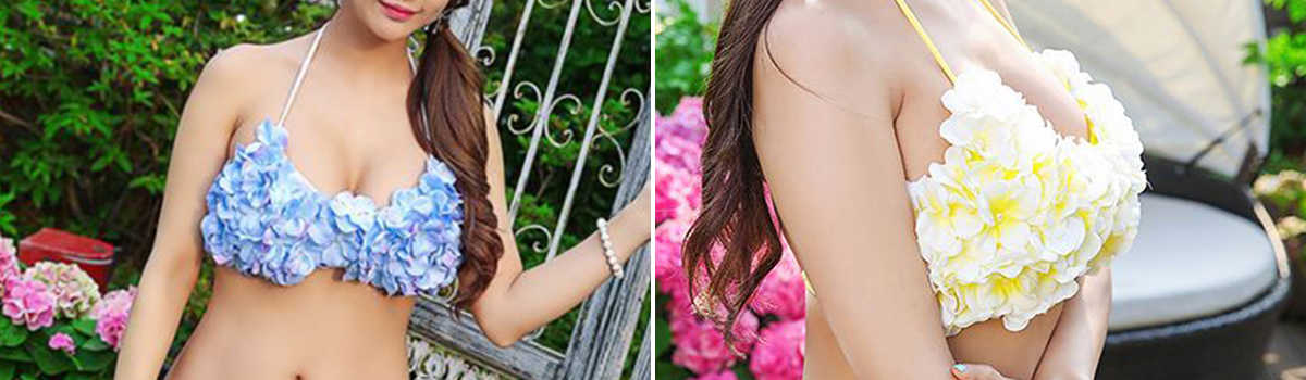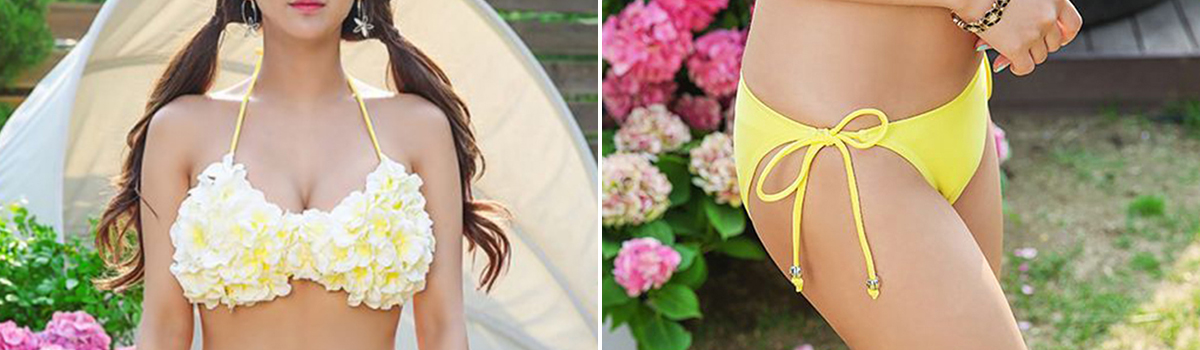 ホルターネックの花びらブラはバストを美しく引き立て、無地サイドリボンパンツはウエストをスッキリ見せてくれます。自信を持って自然な笑顔を振りまけることができる、まさに夏の必須アイテムです。
