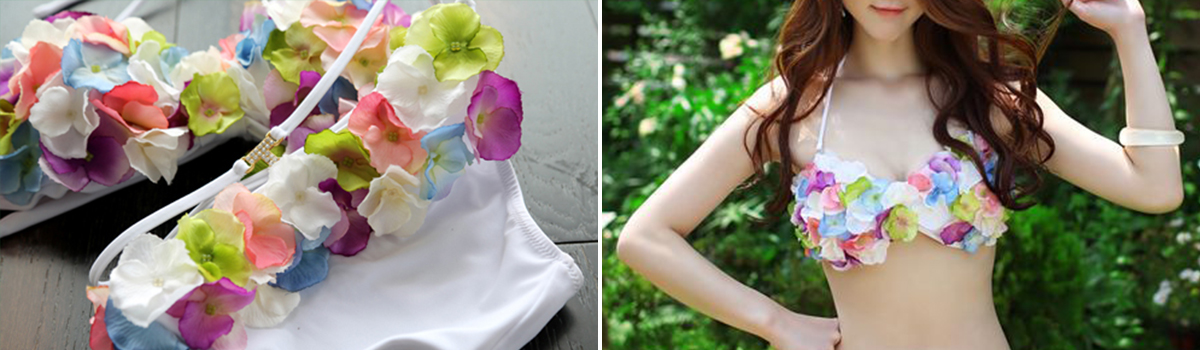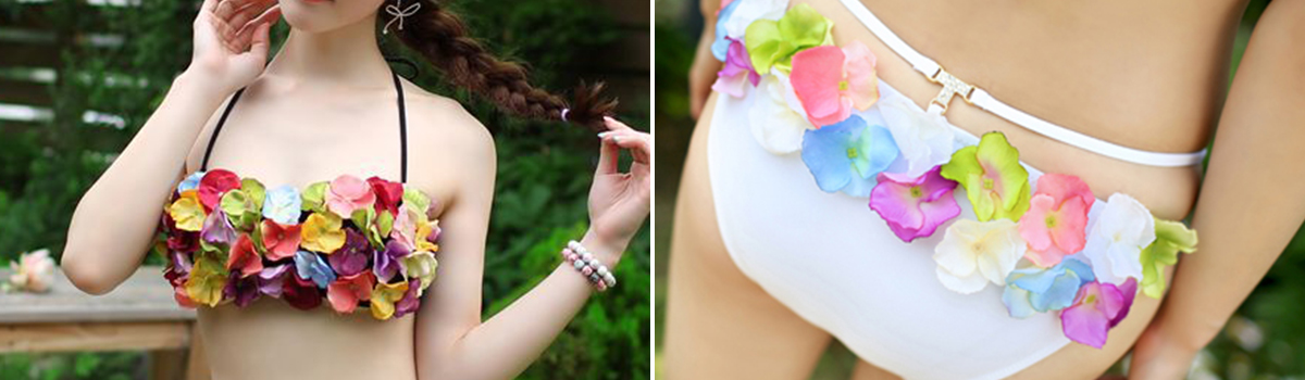 Wストリング花びらパンツとバックリボン花びらブラの組み合わせが、華やかなビーチウェアとして大人気です。水着のディテールは細部までこだわり、花びらのデザインが女性らしさを引き立てます。