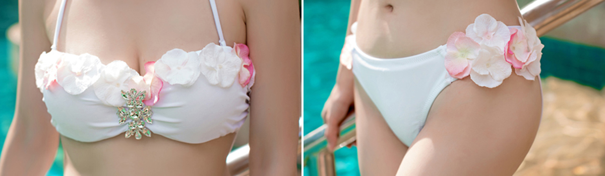 唯一無二のデザインが特徴の「フロントビジュー花びらバンドゥビキニ2点セット」が登場しました。バックリボンの花びらバンドゥブラとサイドの花びらパンツの2点セットで、華やかさと可愛らしさが詰まっています。