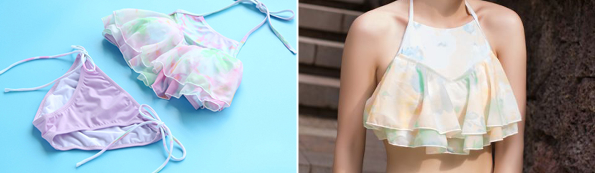 新作ニュアンスカラーティアードフリルビキニ2点セットが登場!ワイヤー入りのブラでバストをしっかりサポートしつつ、アメリカンスリーブとフリルが女性らしい魅力を引き立てます。