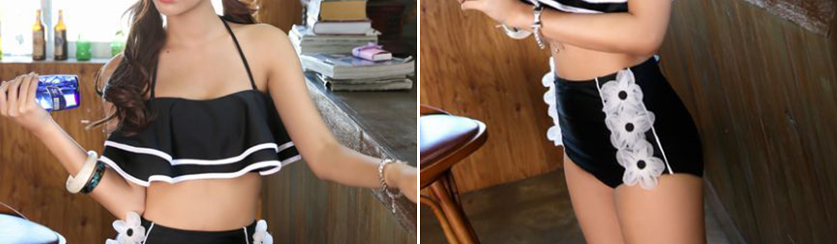 クールフラワーがビビットカラーに映えるビキニ2点セットが登場しました!2重フレアのデザインには黒パイピングが施され、ホルターリボンにも可憐な花が咲きます。ハイウエストのパンツにはサイドラインに花が施されています。
