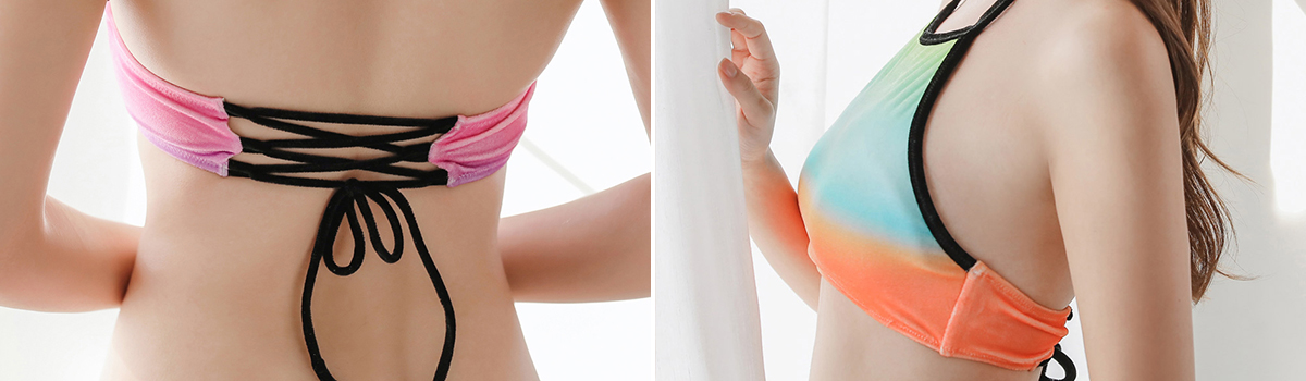 バックレースアップのブラはセクシーさを演出し、サイドリボンのパンツは脚をキュートに長く見せてくれます。また、グラデーションカラーが施されたデザインは、夏の陽光の中で一際輝きます。