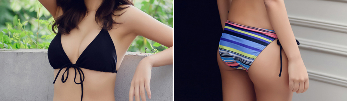 ブラにはリボン、サイドにはリボン、そしてパンツには鮮やかなボーダーデザインが施されており、トレンド感たっぷりの仕上がりです。