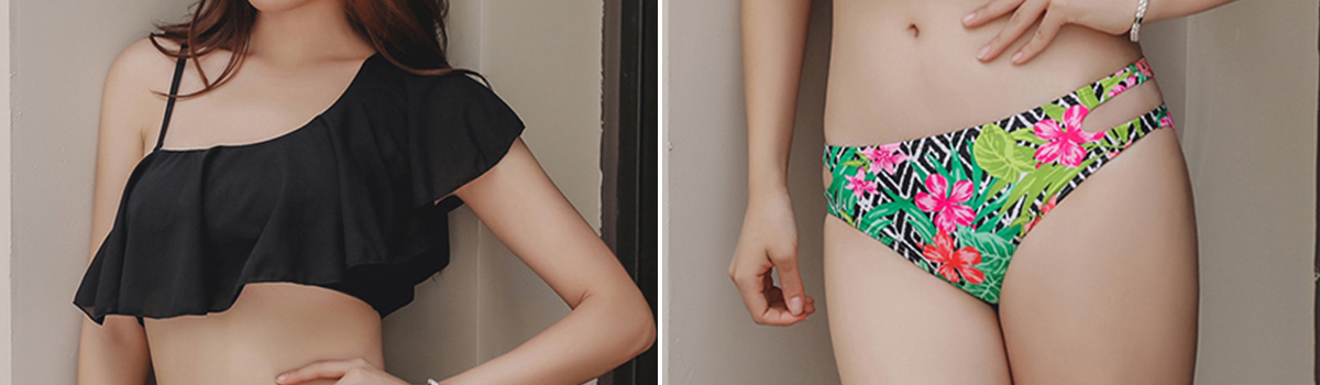 海辺のリゾートやプールサイドで華やかな存在感を放つシフォンワンショル×鮮やかハイビスカス柄ビキニ2点セットが登場!シフォンフレアがエレガントなワンショルダートップスと、幾何学柄に鮮やかなハイビスカスが映えるサイドカットアウトパンツの組み合わせです。