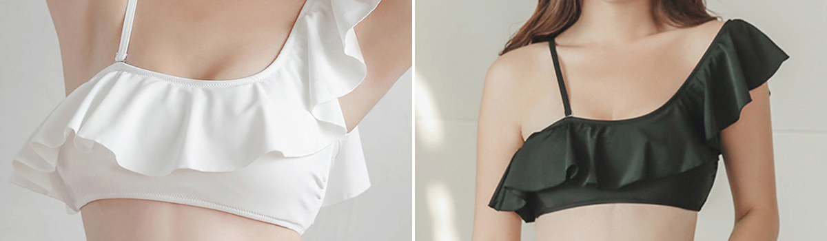 華やかなフリルワンショルダーとスタイリッシュなサイドクロスストリングが特徴の、ワンカラーフリルワンショルダーのビキニ2点セットが登場しました。