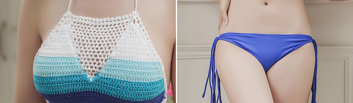 夏のビーチシーンを彩る一着、タッセル揺れるクロシェハイネックのビキニ2点セットが登場しました!ホルターネックのブラとサイドタッセル入りのパンツがコーディネートされ、ボーダー柄と無地の2色展開になっています。