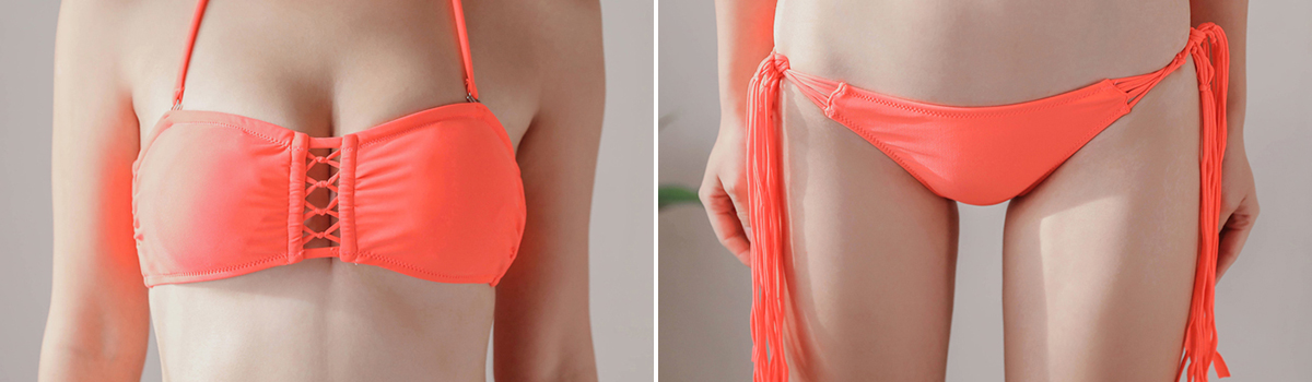 バンドゥブラはフロントに施されたクロスデザインが、着る人の魅力を引き立たせてくれるだけでなく、バックのリボンが後ろ姿も華やかに演出してくれます。一方のサイドタッセルパンツは遊び心溢れるデザインで、ビーチやプールサイドで目立つこと間違いなしです。