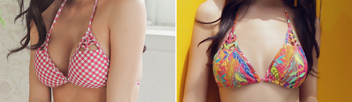 三角形のビキニトップは、程よいカバレッジがありながらもセクシーな魅力を漂わせます。胸元に施された柄がアクセントとなり、個性的なスタイリングを楽しめます。また、ヒップ部分のカットが絶妙なバランスで、美しいボディラインを演出します。