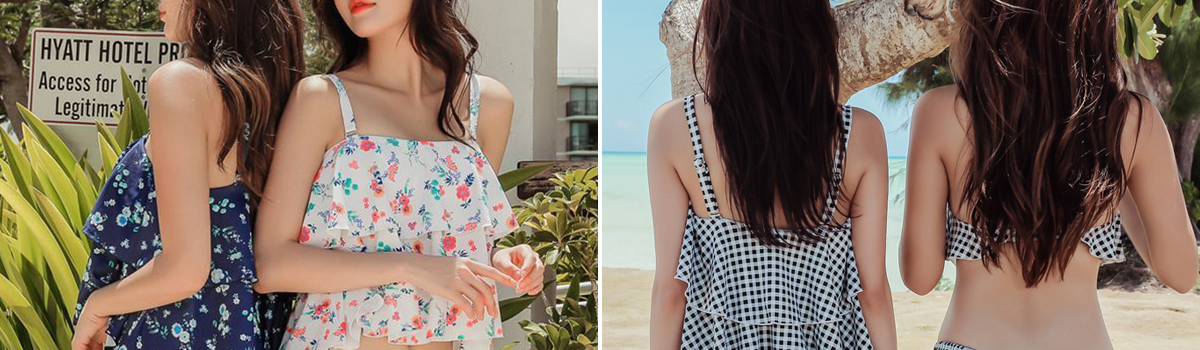 夏のビーチシーンを彩る、二段フレアのバンドゥビキニ2点セットがお目見えです。このセットには、2段キャミソールフリルブラとサイドストリングパンツの2点が含まれています。
