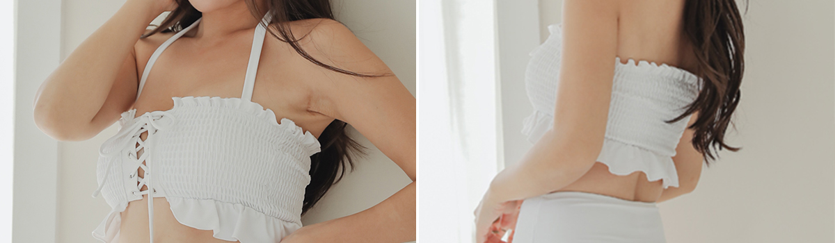 シャーリングデザインが施されたレースアップブラは、セクシーでありながらエレガントな雰囲気を醸し出します。胸元のリボンを結んで自分好みにアレンジも可能!一枚でビーチサイドを彩ります。