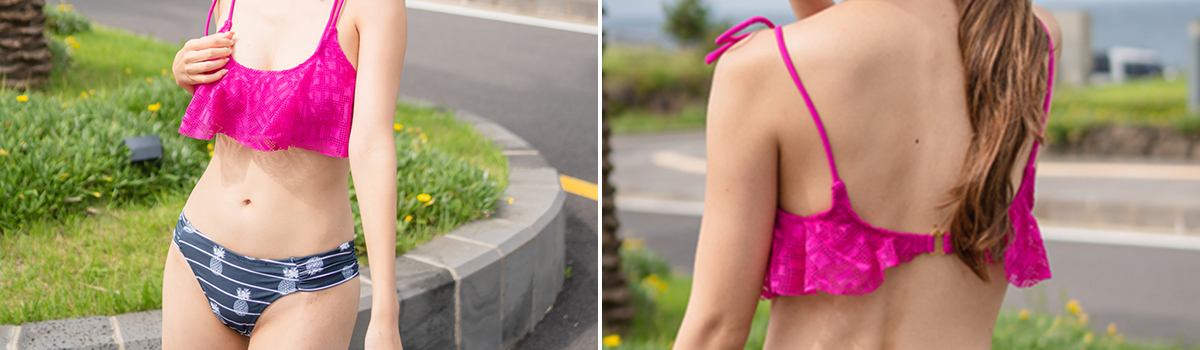 ブラはレース素材で作られフェミニンな魅力を引き出してくれます。一方、パンツは鮮やかなパイナップル柄が目を惹き、ビーチやプールサイドで注目を集めること間違いなし!オシャレなデザインで、トレンド感満載のアイテムです。