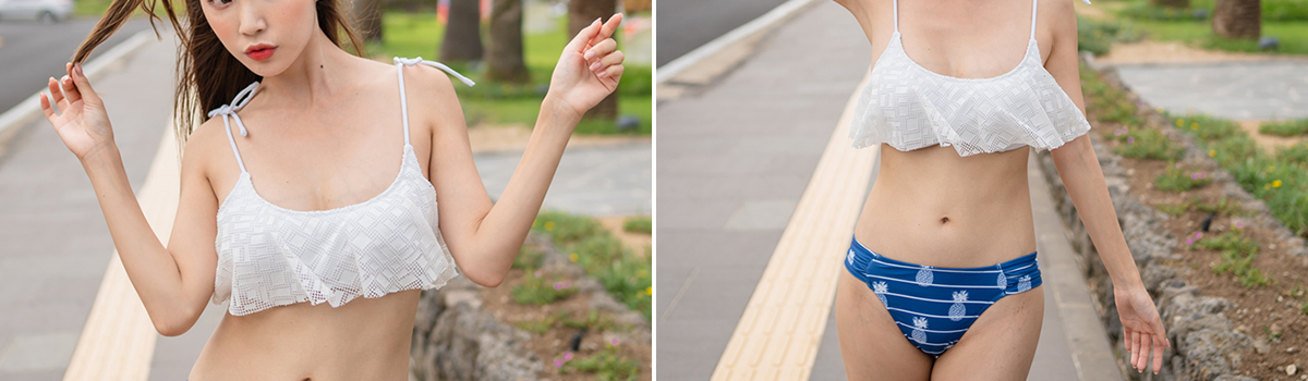 この夏、ビーチで一際輝く存在になりたい方にぴったりなのが、「バイカラーパイナップル柄ビキニ2点セット」です。レースデザインのブラと可愛らしいパイナップル柄のパンツが組み合わさった、セクシーでスイートな2点セットです。