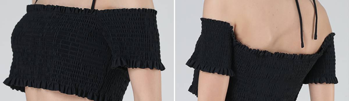 新作のシャーリングオフショルトップスとサイドレースアップハイウエストパンツの2点セットが登場しました。オフショルシャーリングホルターネックブラはセクシーなデコルテラインを演出し、女性らしいシルエットを美しく引き立てます。一方、サイドレースアップのハイウエストパンツは洗練されたデザインで、脚長効果が期待できます。