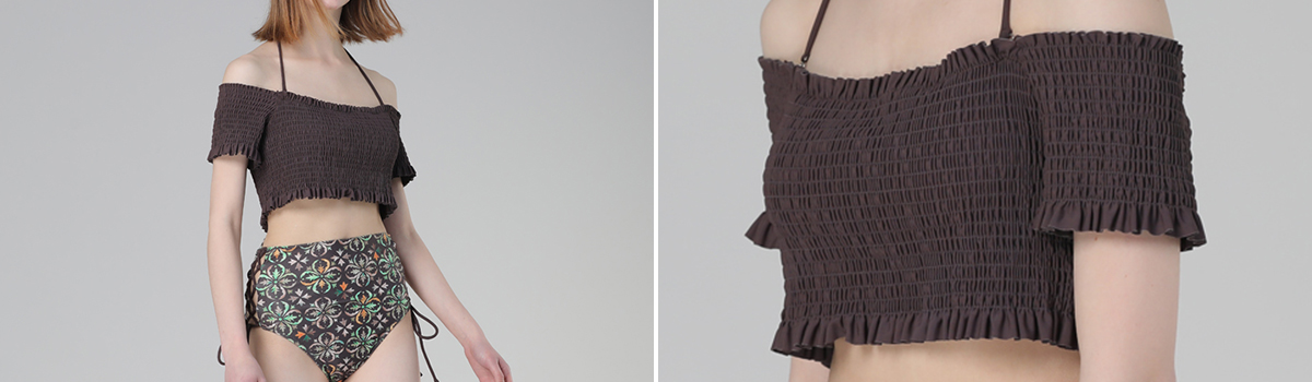 【新生活応援セール最大20%OFF】シャーリングオフショルトップス×サイドレースアップハイウエストパンツビキニ2点セット