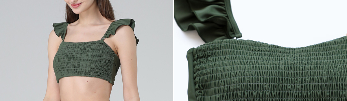 バックリボンフリルショルダービキニ2点セットは、ショルダーフリルとシャーリングデザインが特徴的な水着・ビーチウェアセットです。存在感のあるバックリボンが後ろ姿も可愛らしく演出し、女性らしいフェミニンな雰囲気を醸し出します。