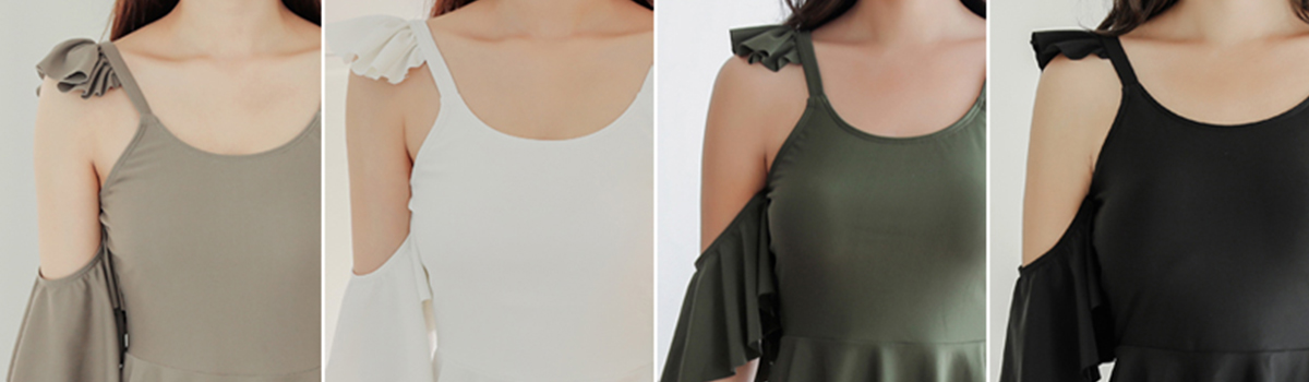 アースカラーのショルダーカットペプラムがクールに華奢魅せ水着2点セットが登場!ショルダーフリルとショルダーカットが女性らしさを引き立てるペプラムキャミと、ハイウエストパンツの2点セットで、洗練された海辺のルックを演出します。