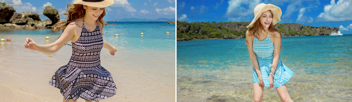 この幾何学柄キャミフレアワンピース水着は、アメリカンスリーブデザインがおしゃれなワンピース型水着です。そのフレアなシルエットが、女性らしさを引き立てながら、遊び心も演出してくれます。