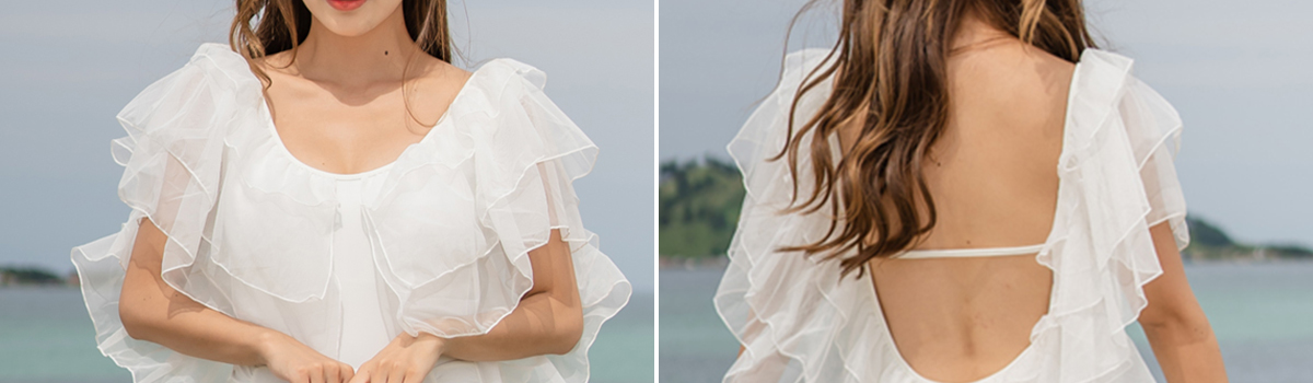 上品な魅力を放つこのワンピース水着は、存在感ある大きめフリルが甘すぎずに大人の女性にぴったりです。ワンピースのデザインが華やかさを演出し、着るだけでおしゃれなビーチウェアとして輝きます。