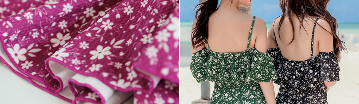 小花柄のデザインが涼しげで女性らしさを引き立てる一着です。オフショルダー仕様で肩やデコルテを美しく見せつつ、ボリュームのあるフレアスカートが揺れるたびに上品な優雅さを醸し出します。水着としても着用可能な素材で、水辺で過ごす時間もオシャレに演出できます。