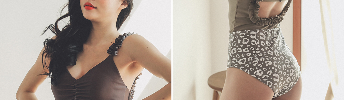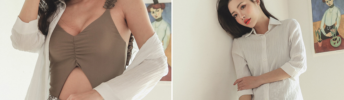 ワンピース水着はフェミニンなデザインで、フリルショルダーが華やかさをプラス。ウエストカットアウトがセクシーさを演出し、女性らしさを引き立てます。一方のシャツはクールな印象で、抜け感のあるスタイリングが可能です。