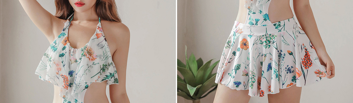 ボタニカル柄のモノキニワンピース2点セットが、この夏のビーチシーンを華やかに彩ります。胸元のフリルやサイドリボン、サイドウエストのカットアウトなど、ディテールにこだわったデザインが魅力的です。さらに、スカート付きで1つのアイテムで水着からビーチウェアまでカバーできる嬉しい2点セットです。