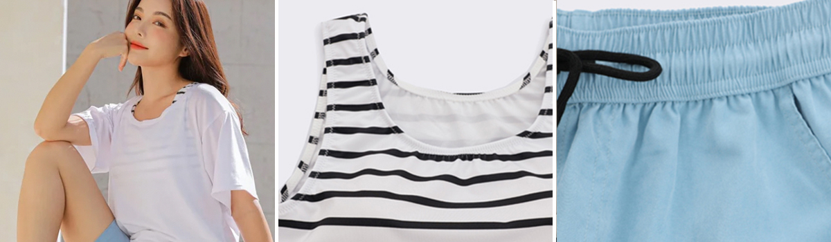 Tシャツはカジュアルなシルエットで、デイリーコーディネートにぴったり。ショーパンは動きやすく、アクティブなシーンでも活躍してくれます。そして、タンキニはお腹も隠せる長さで冷え対策にも。