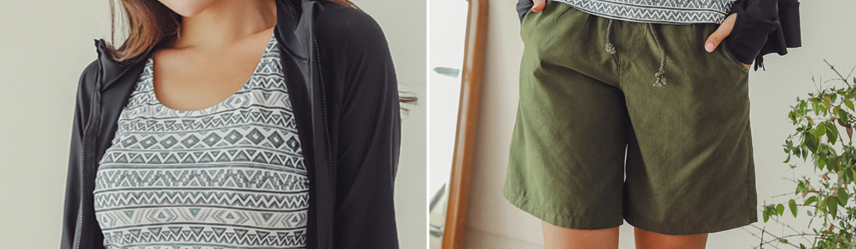ラッシュガードはUVカット効果があり、長袖デザインで紫外線から肌を守ります。さらに、フード付きなので、首元や頭部もしっかりとガード!ハーフパンツは脚をスッキリ見せてくれるだけでなく、UV対策もしっかりと行えます。
