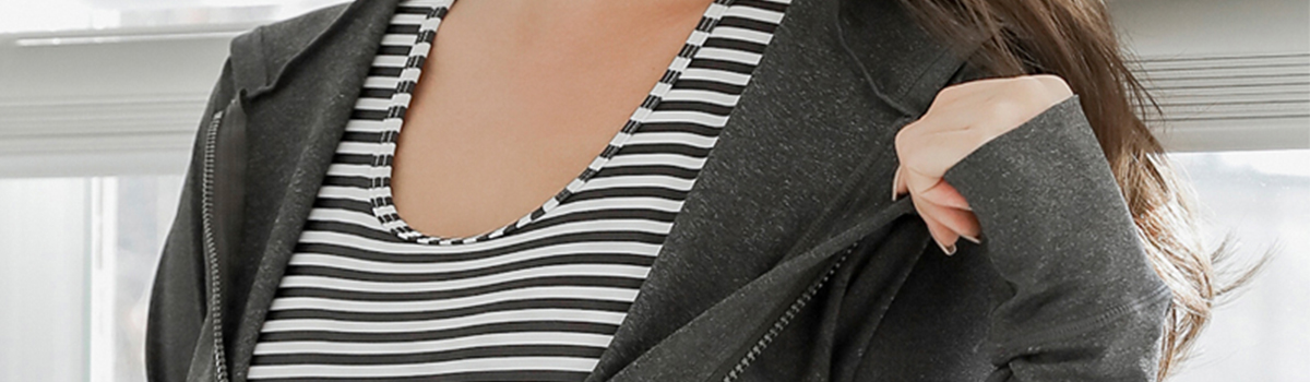 ボーダーデザインのスポブラとハイウエストパンツは、体型をカバーしつつおしゃれに見えるデザイン。さらに、フード付きラッシュガードは紫外線から肌を守りながらスポーティーな印象を演出します。付属のアースカラーショートパンツもカジュアルで着心地抜群です。
