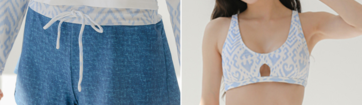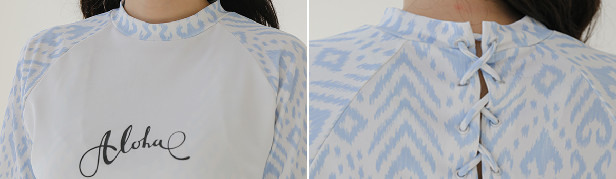 エキゾチックでセンシュアルな魅力を纏った、レースアップラッシュガード エスニック柄ホルタービキニ4点セットが登場。フロントカットアウトブラとパンツ、そしてバックを飾るレースアップデザインの長袖ラッシュガードとショートパンツのセットで、ビーチでのスタイリングを一気にグレードアップ。