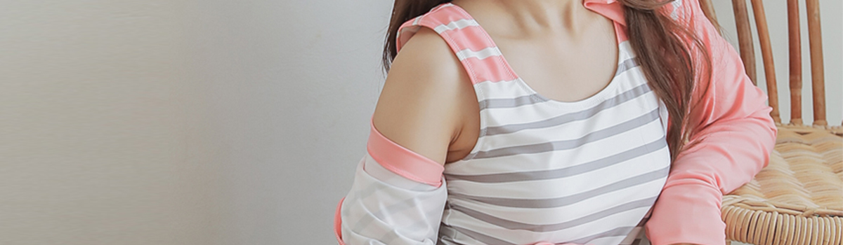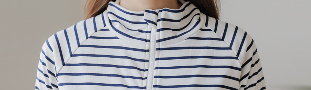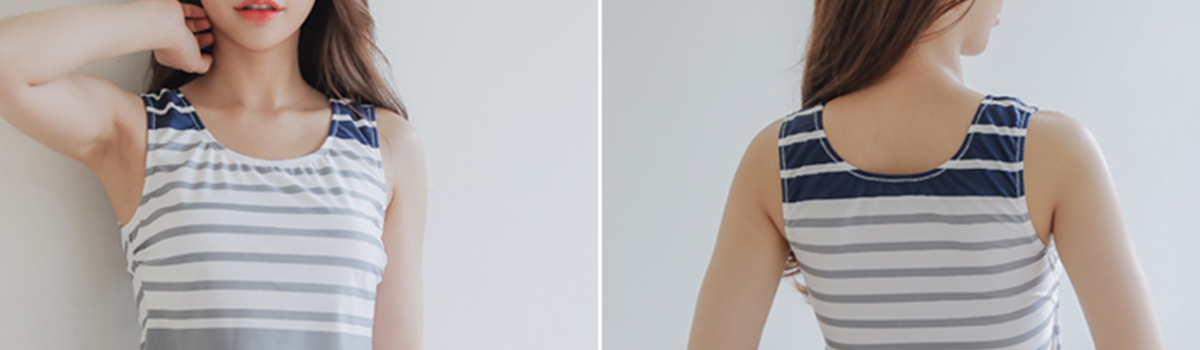 首元から手の甲までしっかりカバーできるラッシュガード4点セットが登場しました。ボーダータンキニ、ボーダーラッシュガード、無地ハーフパンツの4点セットで、ビーチやプールでのアクティブな日差し対策にピッタリです。
