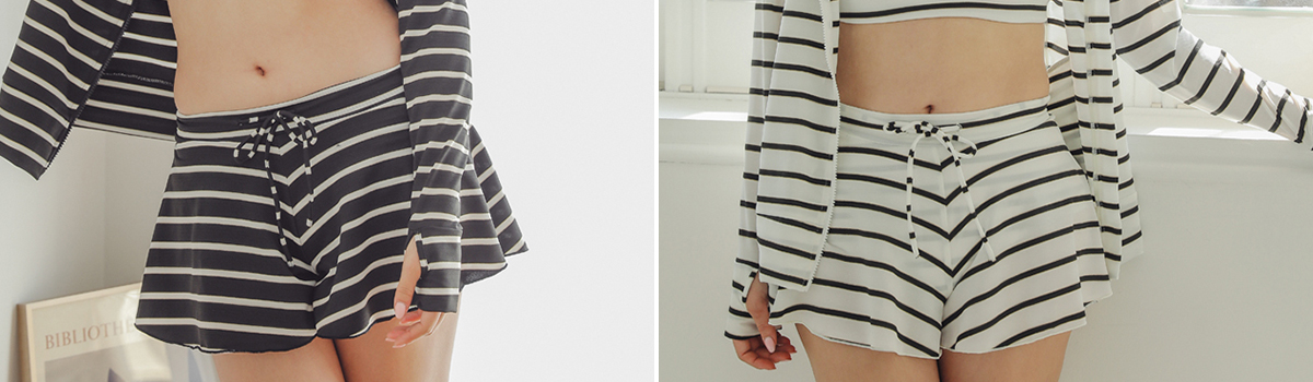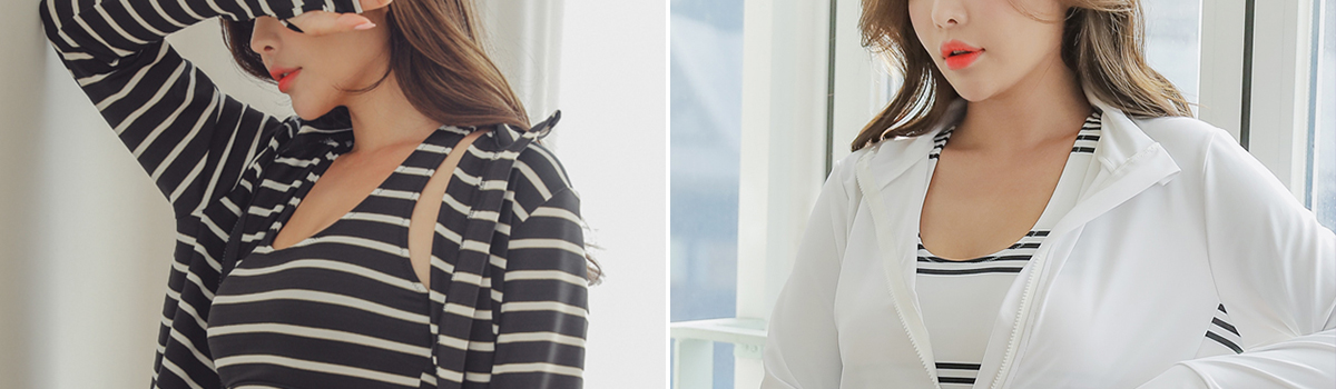 ボーダーデザインが可愛らしさを演出し、スポーツブラのようなトップスでアクティブに過ごしたい方に最適なデザインです。ハイネックラッシュガードはUVカット効果があり、ビーチやプールサイドでの日焼け対策にもピッタリ!