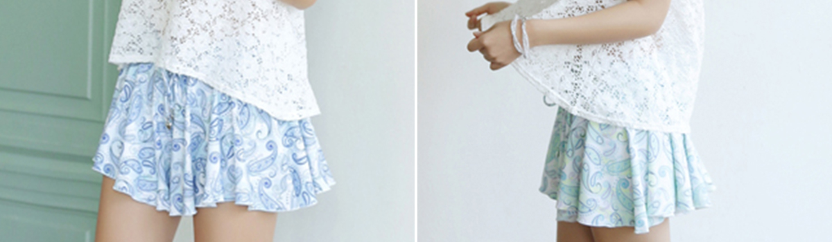 ペイズリー柄ブラはフリルとリボンが華やかなアクセントとなり、女性らしい魅力を引き立てます。パンツとスカパンは程よいフィット感と動きやすさを両立させ、ビーチでのアクティビティを楽しむのに最適です。