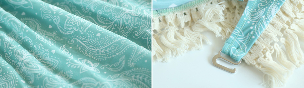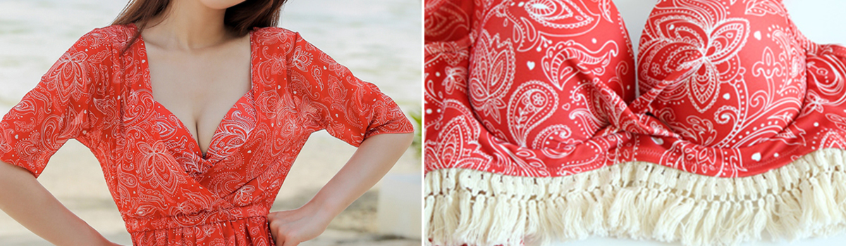 カシュクールワンピ付き体形カバー水着3点セットは、フリンジブラ、パンツ、そして裾フリンジカシュクールワンピの3点セットで構成されています。