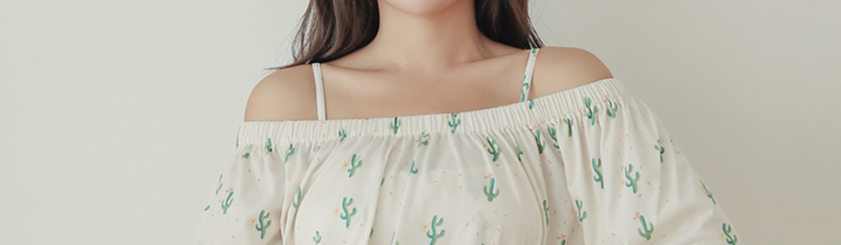バンドゥブラとパンツは、スポーティーでセクシーな印象を演出。オフショルトップスとハーフパンツは、体型をカバーしつつもスタイリッシュなルックスに仕上げてくれます。さらに、小ぶりのサボテン柄が夏らしい爽やかさをプラスしてくれます。