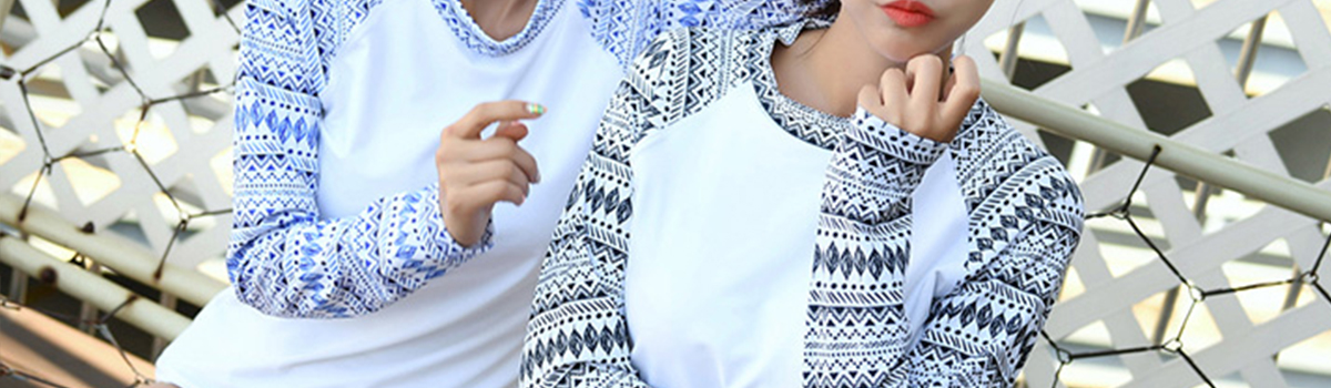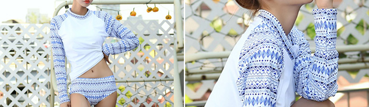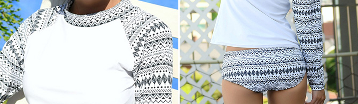 エスニック柄が施されたこのロングスリーブラッシュガード体形カバー水着3点セットは、まさにカジュアルなビーチスタイルを叶えてくれるアイテムです。